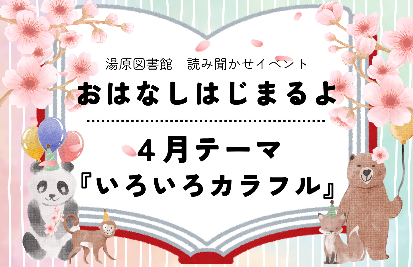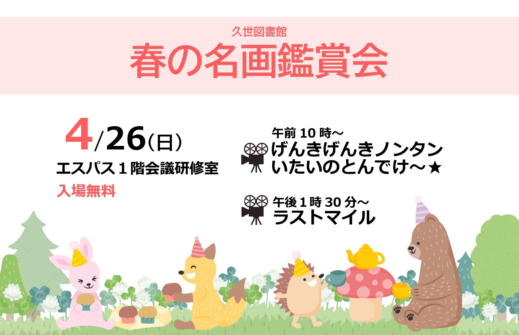真庭市立図書館 本日 3月26日 ( 木 )の 開館状況 中央図書館 蒜山図書館 湯原図書館 美甘図書館 久世図書館 落合図書館 北房図書館 News お知らせ お知らせ一覧 スマートフォンやICカードで貸出ができます 2026/03/10 中央図書館Wi-Fiご利用方法変更のお知らせ 2026/03/04 【結果公表】第2次真庭市図書館みらい計画(案)のパブリックコメント 2026/01/20 (ご意見募集終了しました)第2次真庭市図書館みらい計画(案) 本・資料を探す 新着 開館カレンダー 利用案内 図書館案内 こどものページ ぶっくるん Pick up おすすめの1冊 一覧を見る あるある!? 本を読む気にならない時も…。 緊張感の先に待つものは 本当に液体? とりあえず走ってみよう!! Event イベント 一覧を見る 全て 全館共通 中央図書館 蒜山図書館 湯原図書館 美甘図書館 久世図書館 落合図書館 北房図書館 湯原図書館 イベント 2026/4/18 おはなし はじまるよ 4月「いろいろカラフル」 中央図書館 イベント 2026/4/19 【中央図書館:月イチ映画会4月】燈火(ネオン)は消えず 久世図書館 イベント 2026/4/26 【久世図書館】春の名画鑑賞会 久世図書館 イベント 2026/5/5 【久世図書館】本のリサイクルフェア 北房図書館 イベント 定例イベント北房 落合図書館 イベント 定例イベント落合 久世図書館 イベント 定例イベント久世 湯原図書館 イベント 定例イベント湯原 蒜山図書館 イベント 定例イベント蒜山 現在、該当する情報はありません。 中央図書館 イベント 2026/4/19 【中央図書館:月イチ映画会4月】燈火(ネオン)は消えず 中央図書館 イベント 定例イベント中央 蒜山図書館 イベント 定例イベント蒜山 湯原図書館 イベント 2026/4/18 おはなし はじまるよ 4月「いろいろカラフル」 湯原図書館 イベント 定例イベント湯原 美甘図書館 イベント 定例イベント美甘 久世図書館 イベント 2026/4/26 【久世図書館】春の名画鑑賞会 久世図書館 イベント 2026/5/5 【久世図書館】本のリサイクルフェア 久世図書館 イベント 定例イベント久世 落合図書館 イベント 定例イベント落合 北房図書館 イベント 定例イベント北房 Exhibition テーマ展示 一覧を見る 中央図書館 春 み~つけた 蒜山図書館 Let’s study! 湯原図書館 知らなくても困らない雑学 久世図書館 黄色のなかまたち大集合 落合図書館 ブックサロン100回記念展示 Project 企画 まにわとしょかんチャンネル ジモスタ ブックス 真庭校歌研究室 まにわ図書館ラジオ