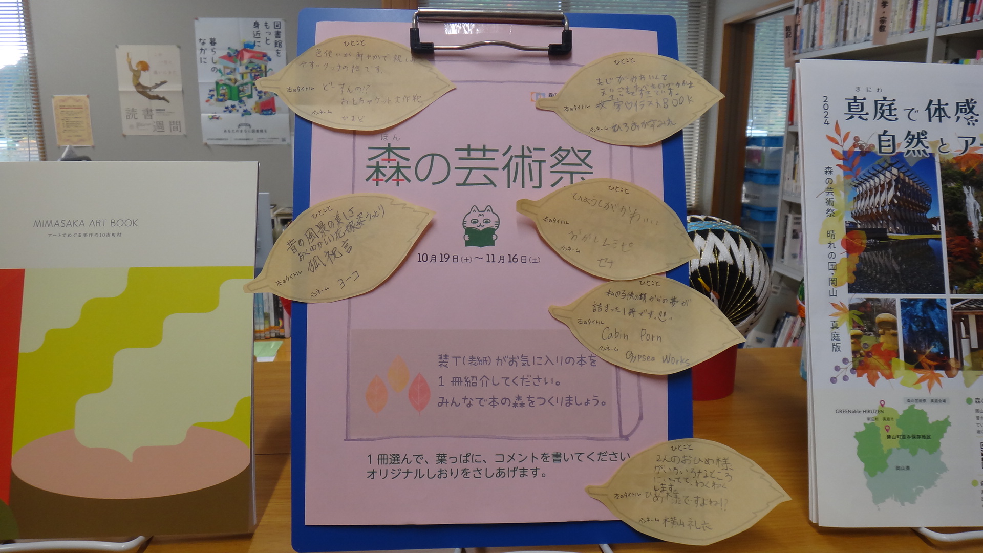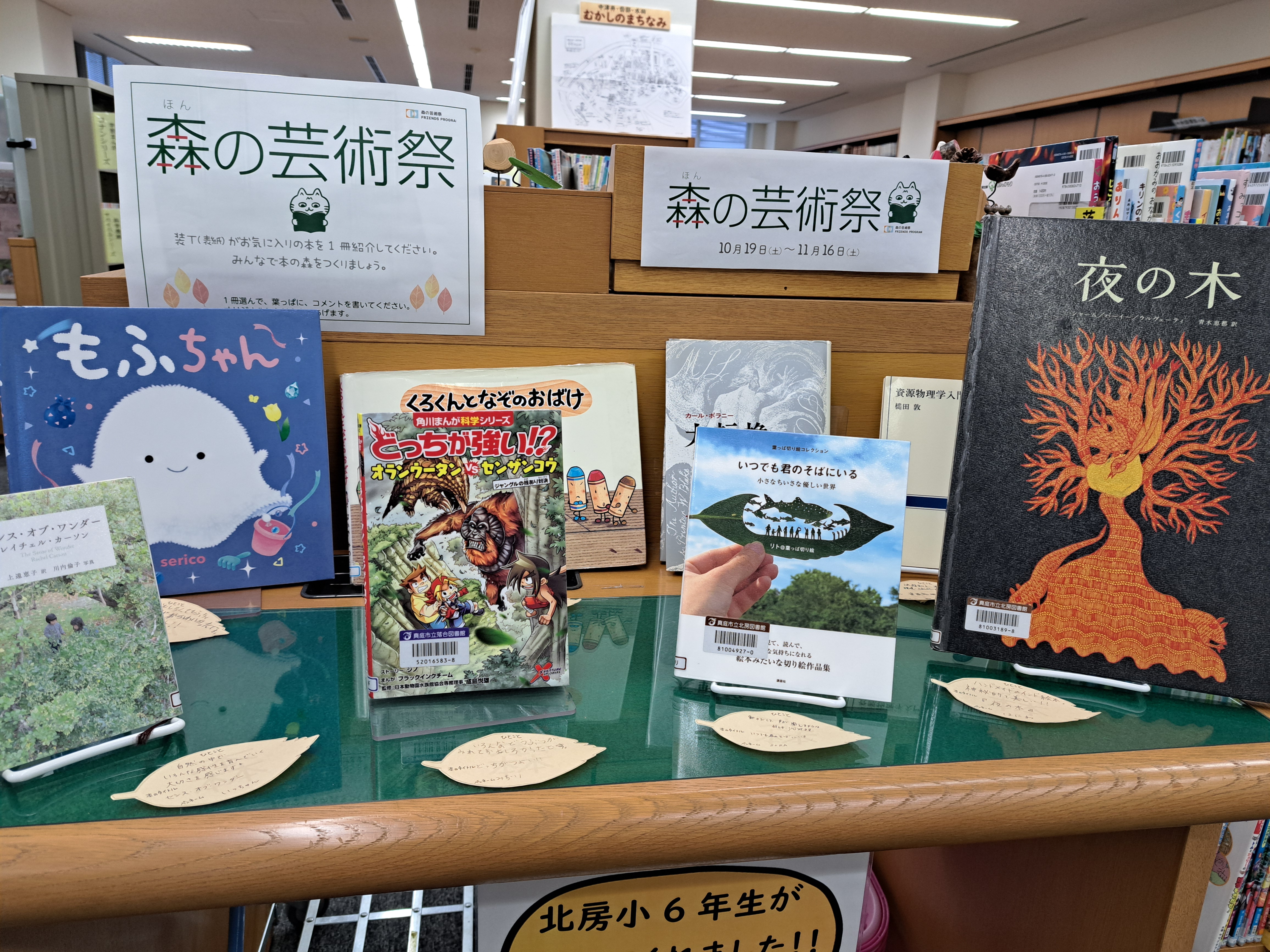 10月19日(土)-11月16日(土) イベント 森(本×3:ほん)の芸術祭 全館共通 イベント一覧 「森の芸術祭」にちなみ、図書館でも「森(本✕3:ほん)の芸術祭」を開催します。 お気に入りの装丁(表紙)の本を1冊紹介してください。 みなさんに紹介してもらった本を使って、すてきな本の森を作ります。 参加してくださった方には、オリジナル「としょかん猫」のしおりをプレゼントします! 全館共通イベントです。ぜひお近くの図書館におこしください! 中央図書館での様子(画像をクリックすると大きくなります) 「森」づくりをしてくださったみなさま、ありがとうございました! SNSでシェア 一覧へもどる