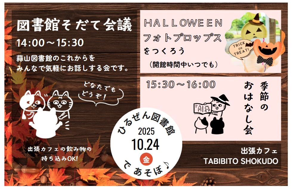 2025/10/24 イベント 蒜山図書館であそぼ&図書館そだて会議 蒜山図書館 イベント一覧 日にち 令和7年10月24日(金) 場所 蒜山図書館 申込 ※そだて会議のみ 蒜山図書館へ来館か電話、またはこちらのフォームからお願いします。 内容 「図書館そだて会議」14時~15時30分/「図書館でこんなことができたらいいな♪」と思ったことはありませんか?図書館のこれからを、みんなで気軽にわいわいお話しする会です。 「季節のおはなし会」15時30分~16時/10月にぴったり!な絵本のよみきかせです。 「ハロウィンフォトプロップスをつくろう!」開館時間中いつでも/もうすぐハロウィン!写真を楽しくするための小道具「フォトプロップス」を作って写真を撮ろう! 出張カフェ「TABIBITO SHOKUDO」11時~14時/出張カフェで購入したものは、蒜山図書館内へ持ち込みOK!おいしいコーヒーやベーグルを食べながらゆっくりお過ごしください。 SNSでシェア 一覧へもどる