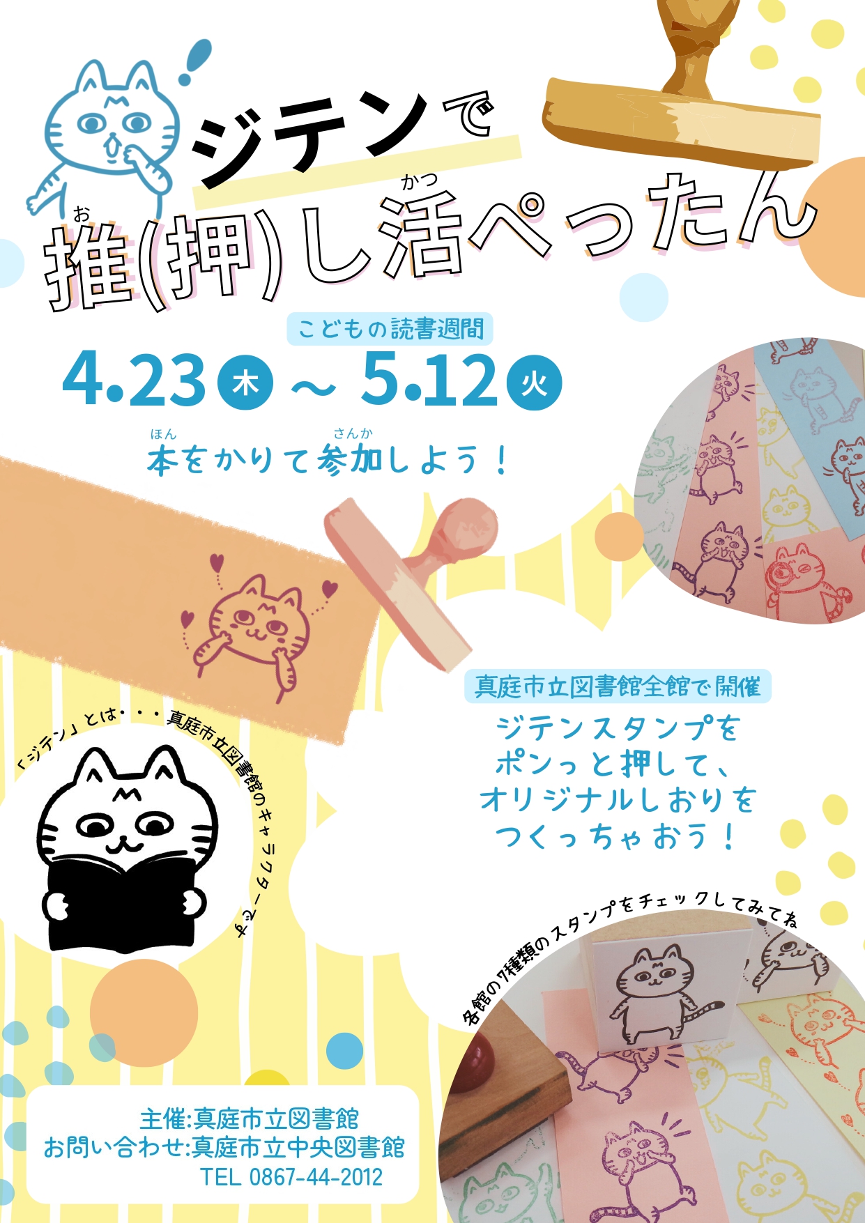 図書館の本を1冊以上借りると参加できるよ!ジテンスタンプをポンっと押してオリジナルしおりをつくっちゃおう!ジテンスタンプの色とデザインは7種類。チェックしてみてね 案内 |